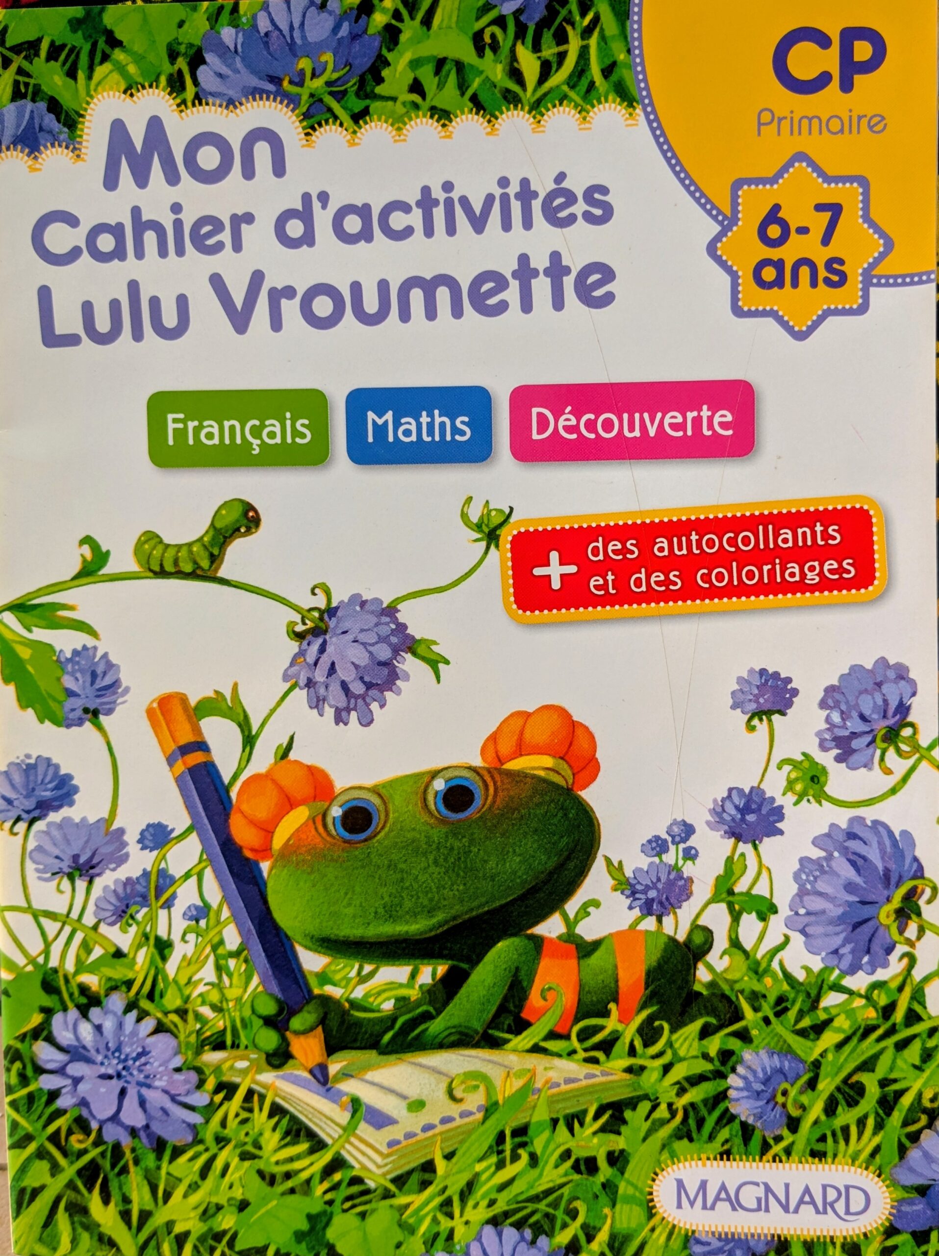 un support ludique pour les enfants en CP (Cours Préparatoire), qui propose des exercices variés en français et maths, des questions d’observation, du graphisme, de l’écriture, et inclue des coloriages et autocollants, avec des corrigés pour consolider les apprentissages de manière amusante.